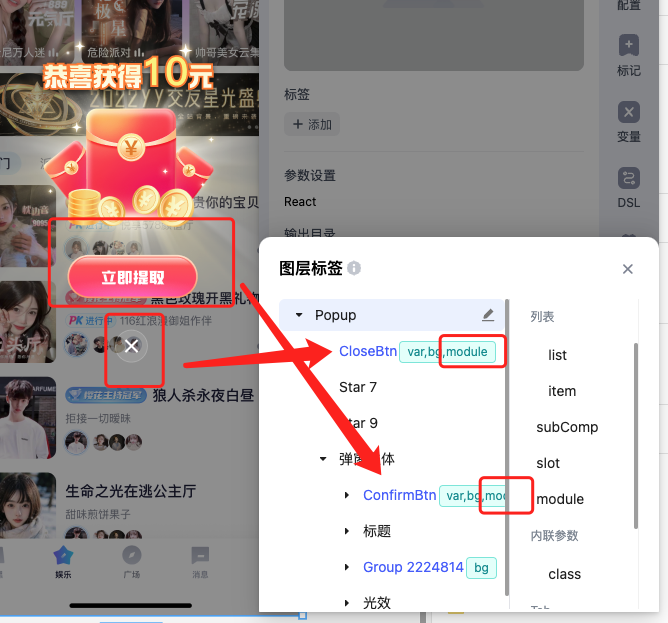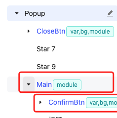 module的用法与subComp一致,唯一的不同是,携带module标签的图层会将自身节点的代码抽取为子组件并放到单独的目录。